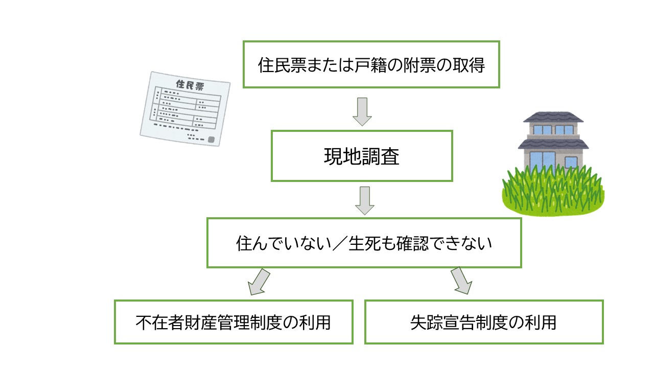 住民票上の住所を訪れても実際には住んでおらず、それ以上その相続人の生死も確認できない場合には、「不在者財産管理制度」の利用を検討します。