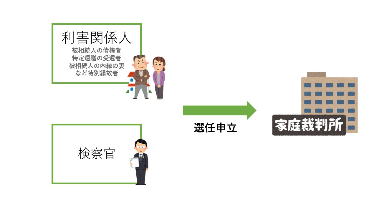 ア 相続財産清算人は、申立人からの申立てに応じて家庭裁判所が選任します。申立権者は、「利害関係人」と「検察官」です。利害関係人には、被相続人の債権者、特定遺贈の受遺者、被相続人の内縁の妻といった特別縁故者などが挙げられます。特別縁故者は、相続人や包括受遺者がおらず、相続財産清算人が相続財産を清算した後に初めて残余財産からの分与を受けることができるため、利害関係人となります。