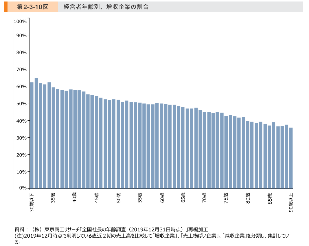 次に、経営者の年齢別増収企業の割合を見てみます。経営者年齢が30代以下の企業では増収企業の割合が6割程度であるのに対し、80代以上の企業では4割程度であり、経営者年齢が上昇するほど増収企業の割合が低下しているものとみることができます。