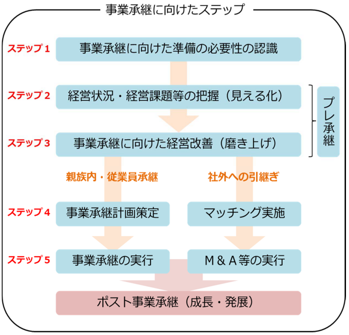 中小企業庁は、「事業承継ガイドライン」(平成18(2006)年公表。平成28(2016)年改定。)において、事業承継の円滑な実行のための5つのステップ(下表)を示しています。